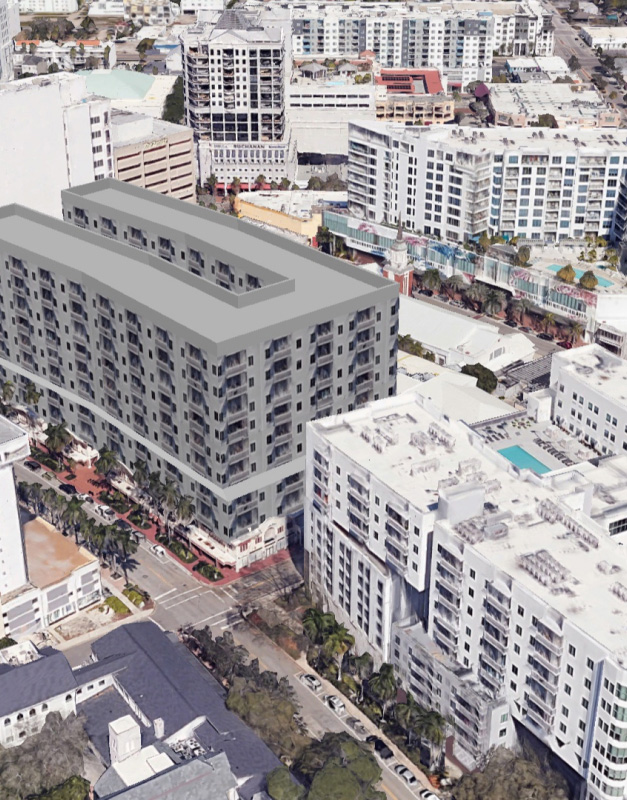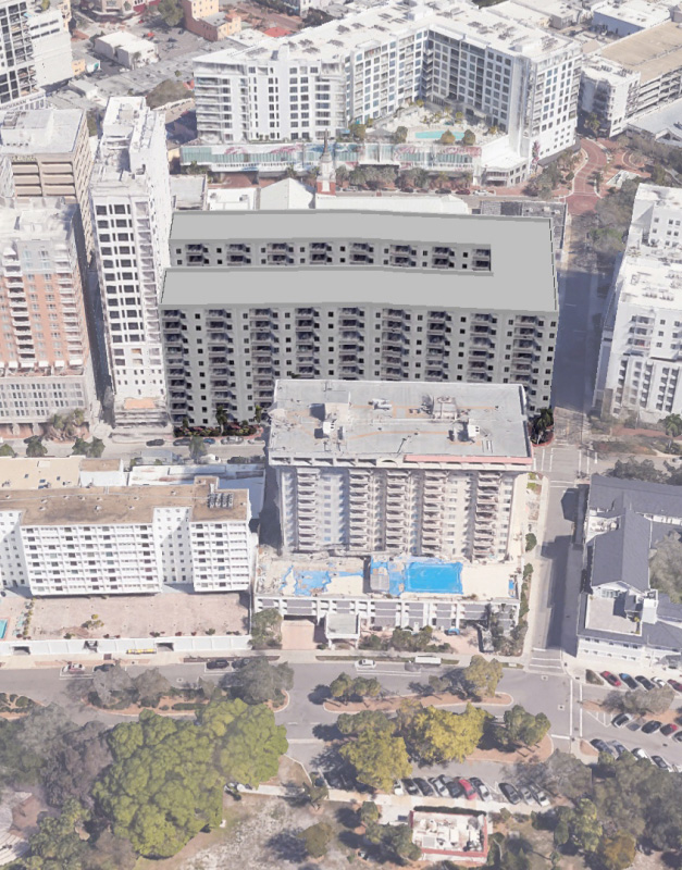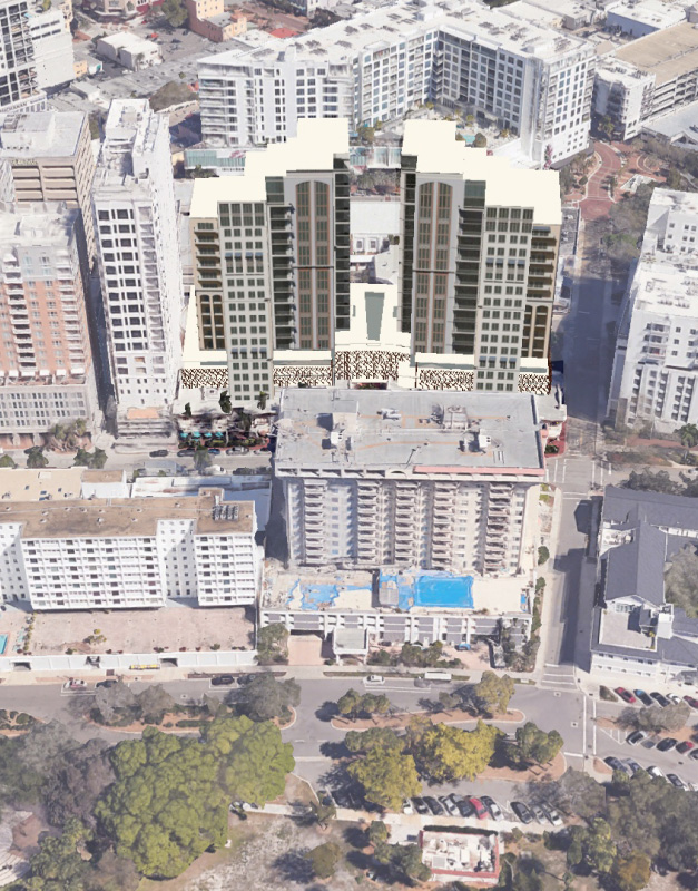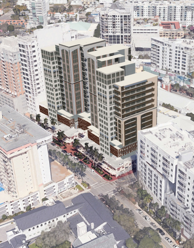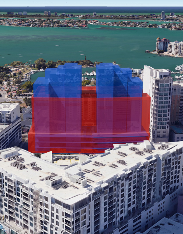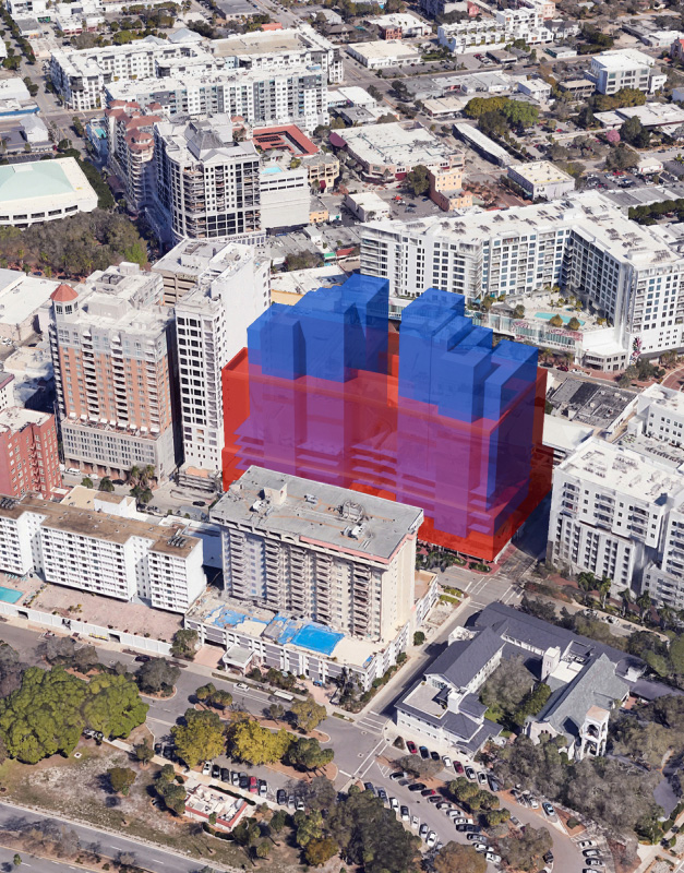 The developers will request a rezone from the city of Sarasota to Downtown Bayfront (DTB) to allow for none of the above uses, except for single family and multi-family attached and detached housing and mixed-use developments, 50 units/acre and an 18-story maximum building height.